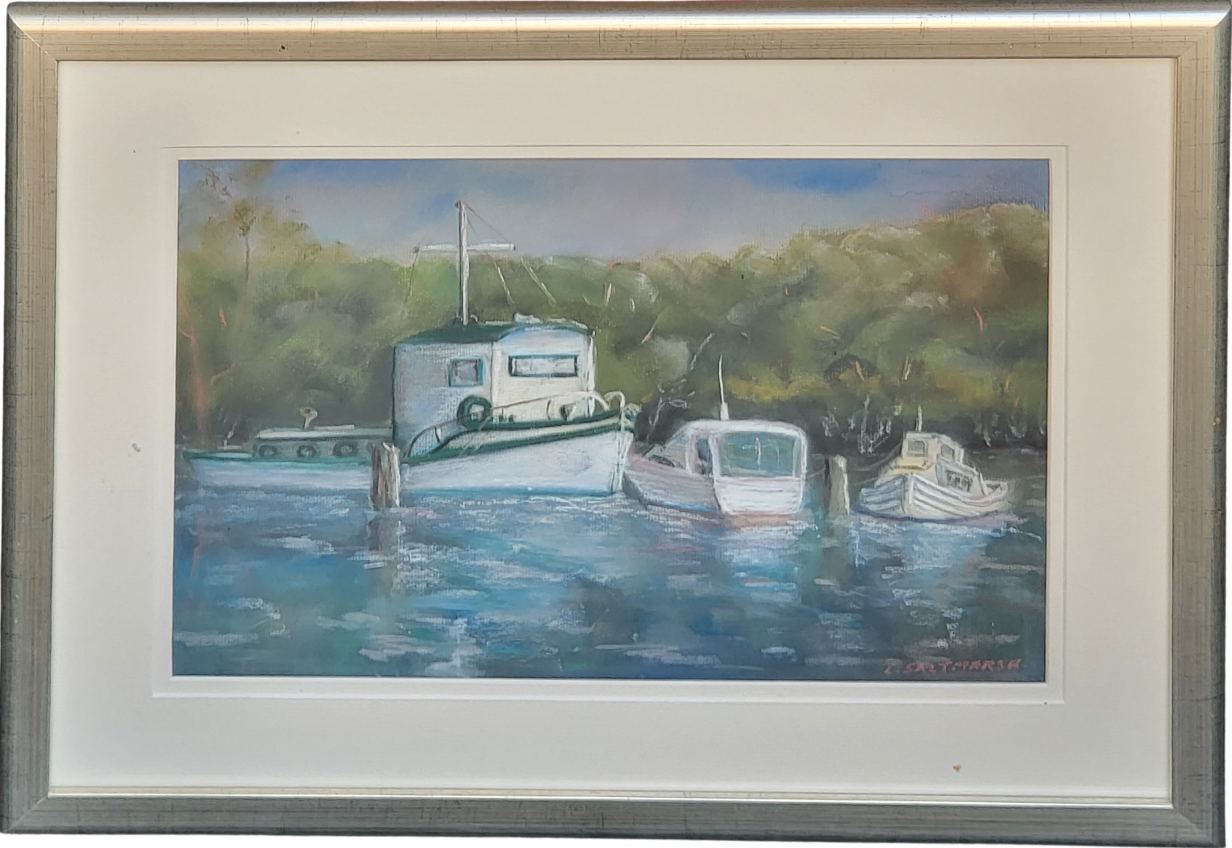 Pastels allowed Lorraine to explore atmosphere with delicacy, using gentle transitions between light and shade to convey movement in the rippling water. Unlike her bolder oils, this medium lends the work a dreamlike calm, as if the boats rest not only in the river but in memory.