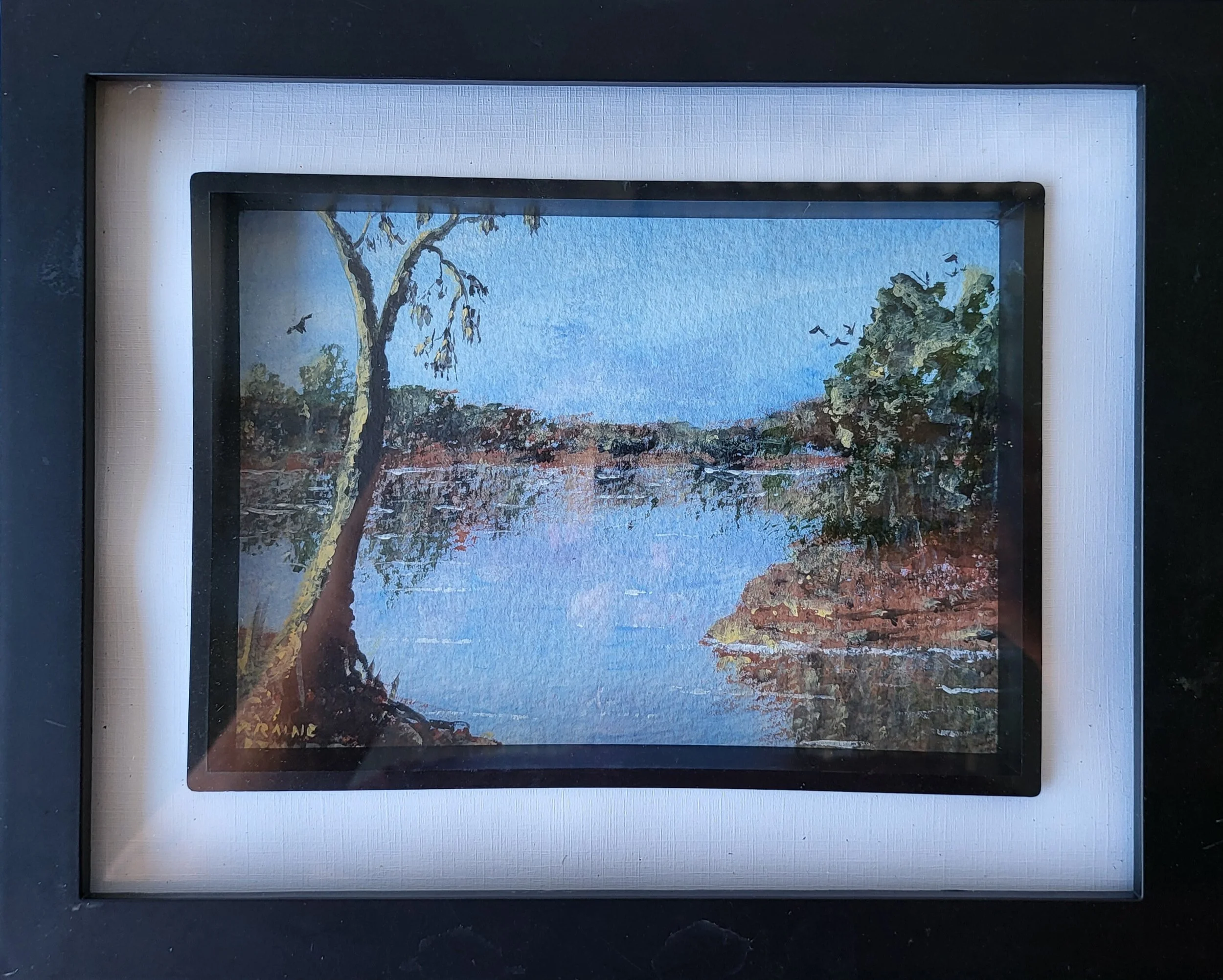 This delicate watercolour captures the stillness of the Murray River, where red earth meets calm water beneath a clear blue sky. Birds rise from the treeline, while the reflections of gum and foliage ripple faintly across the river’s surface.