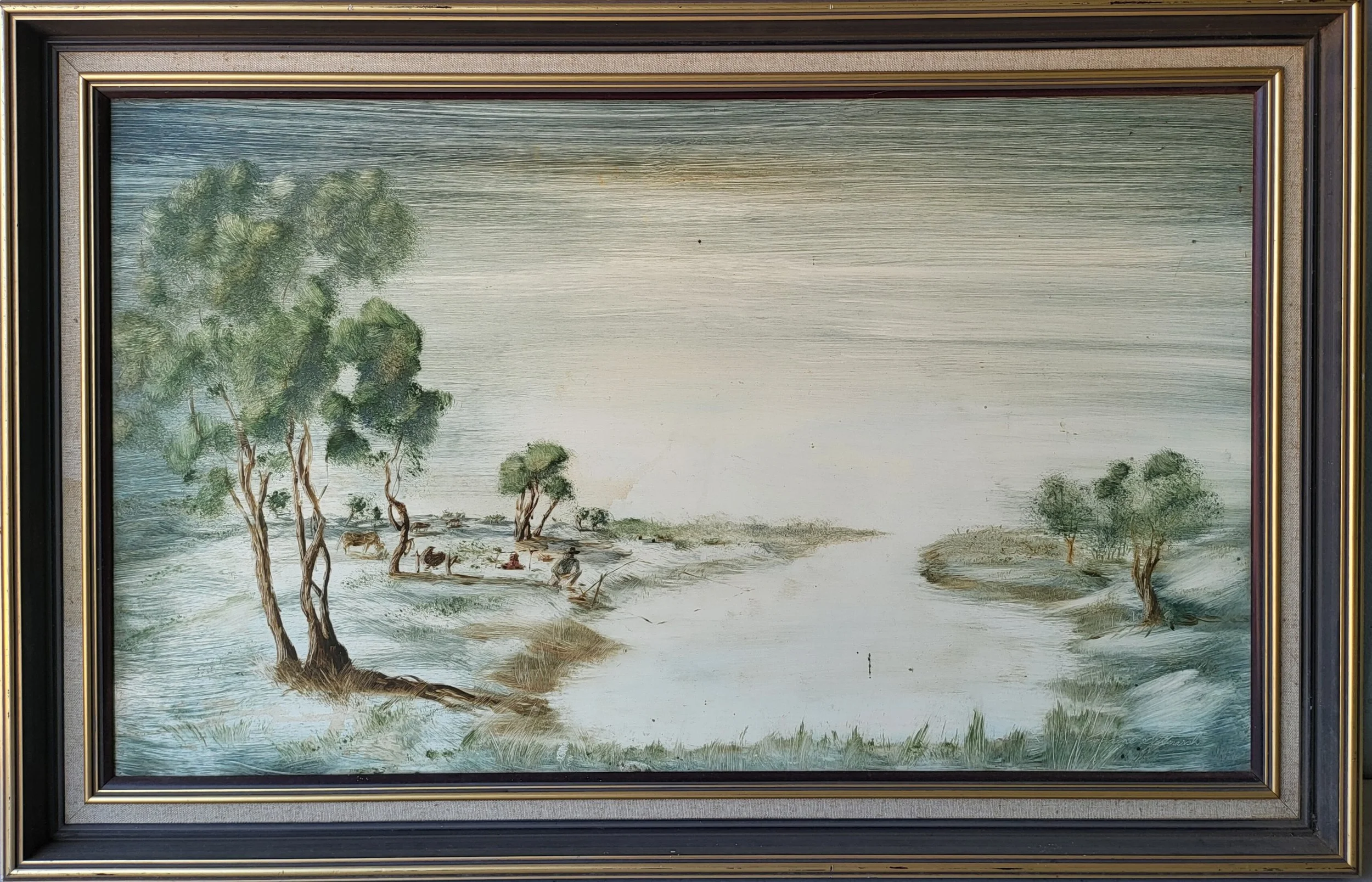 This early work by Lorraine Saltmarsh depicts a quiet pastoral scene along a riverbank, where cattle graze and figures tend to the land beneath sparse gum trees. Executed in oils on board, the painting demonstrates her emerging style; balancing delicate brushwork with a soft, atmospheric palette of greens, browns, and muted skies.
