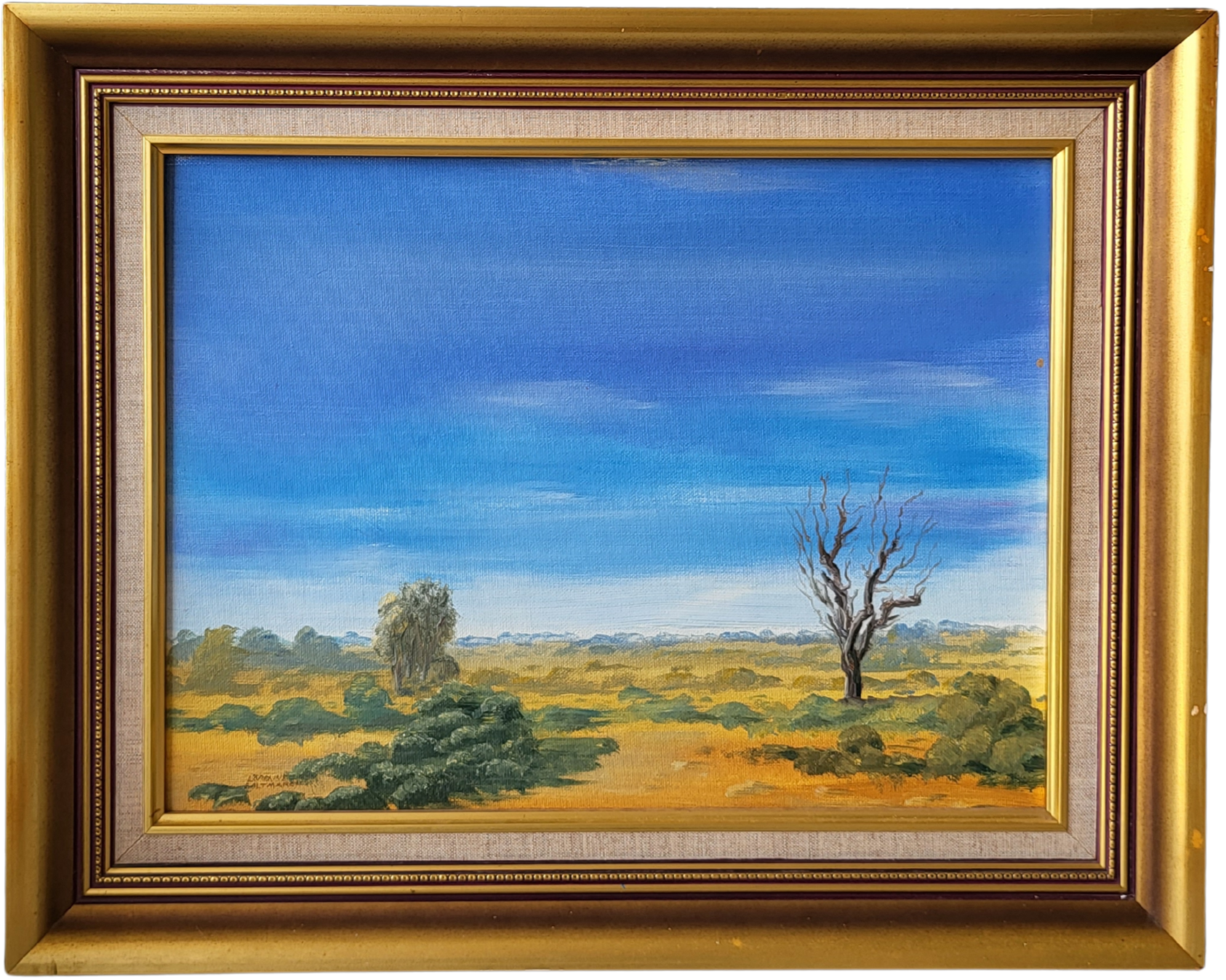 Painted during the 1960s–70s, this work is one of Lorraine’s earlier explorations of rural life, capturing both the physical landscape and the rhythms of community that shaped her career-long devotion to recording the Australian bush.