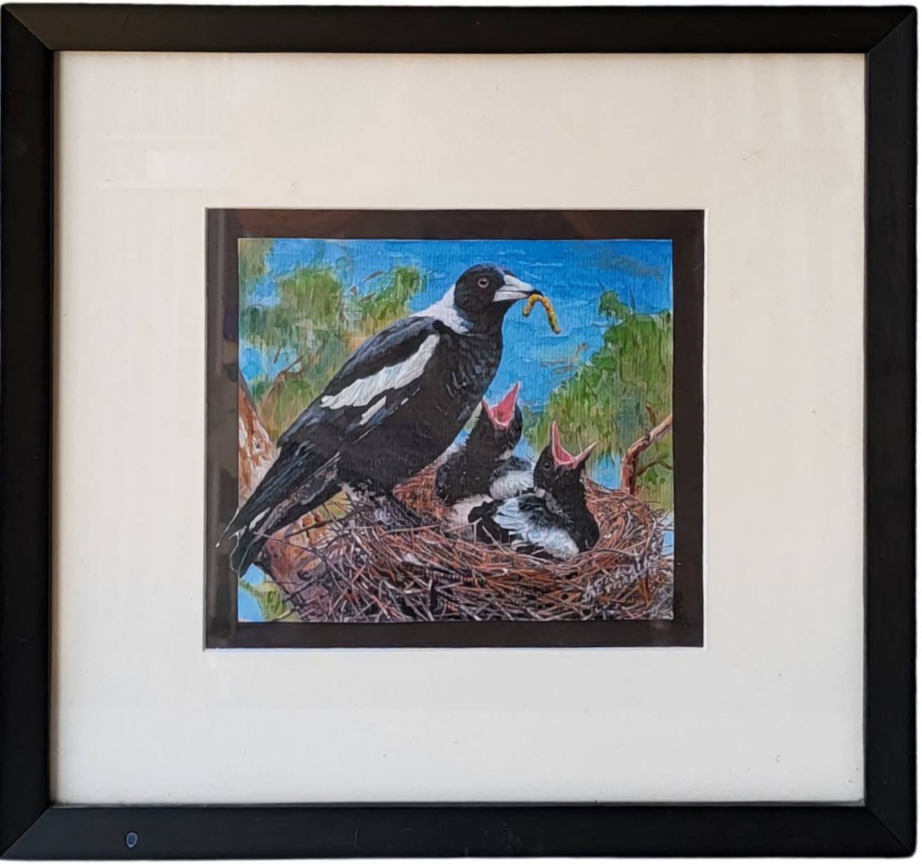 This vivid piece captures a parent magpie returning to its nest with food for its chicks. The scene is full of life; the young birds cry out with open beaks while their parent balances on the woven twigs of the nest, set against a backdrop of Riverina sky and gum leaves.