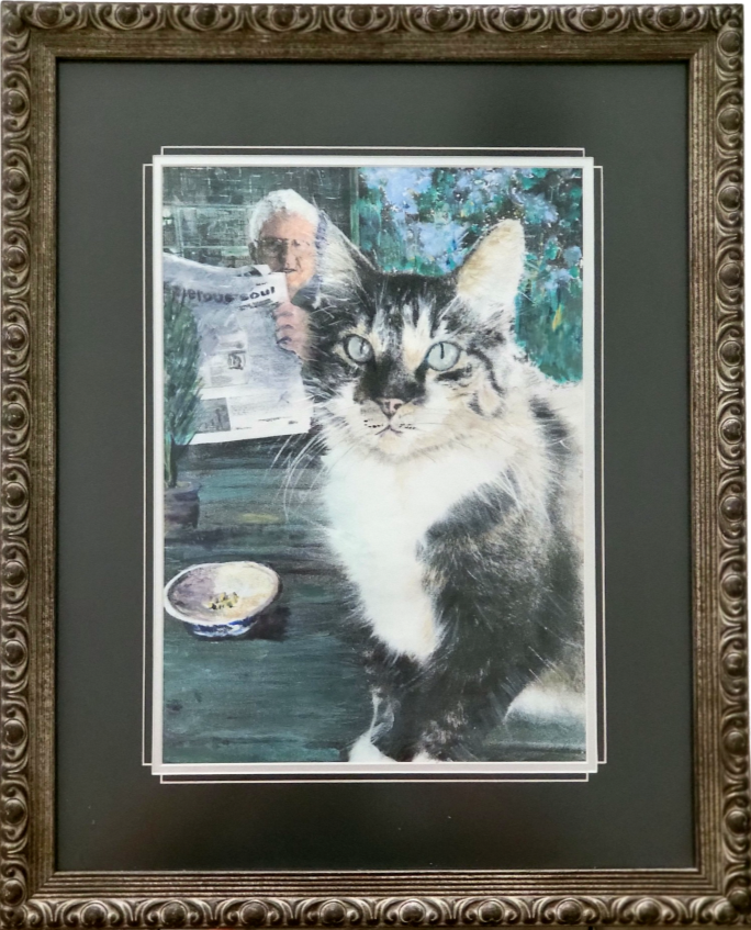In the foreground, the family’s cat (Motor) gazes directly outward, its presence commanding, yet affectionate. Behind, Max is depicted reading the newspaper beneath the shade of gumtrees, while the background suggests the lively chorus of birds that so often visited the couple’s home.