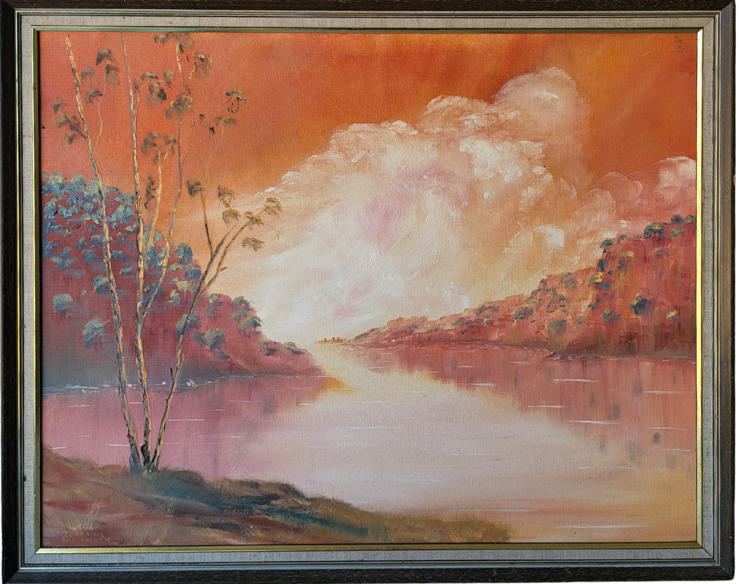 This painting, likely created in the 1980s, captures Lorraine’s ability to fuse drama and serenity within the Australian landscape. A brilliant sky of molten orange and rose tones fills the canvas, dominating the scene with luminous energy. Billowing white clouds rise above a tranquil river, their soft forms reflected in the still water below.