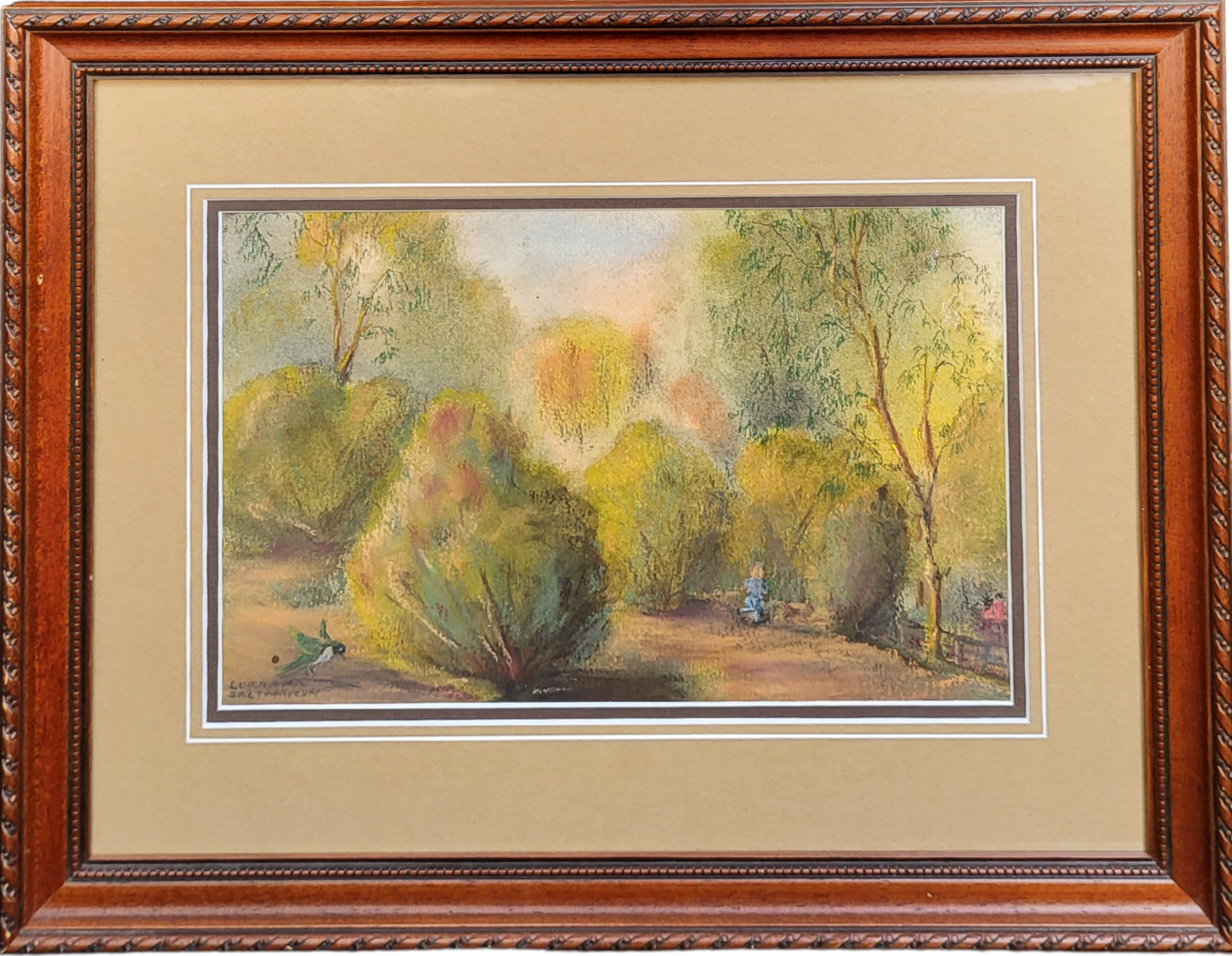 The scene is subtly animated by the inclusion of children moving quietly among the foliage. Their presence invites viewers to consider the intimacy of community life in rural Australia, where human activity and natural environment exist in quiet harmony. A bird in the foreground adds a further touch of liveliness, reinforcing Lorraine’s talent for balancing the stillness of landscape with signs of movement and life.