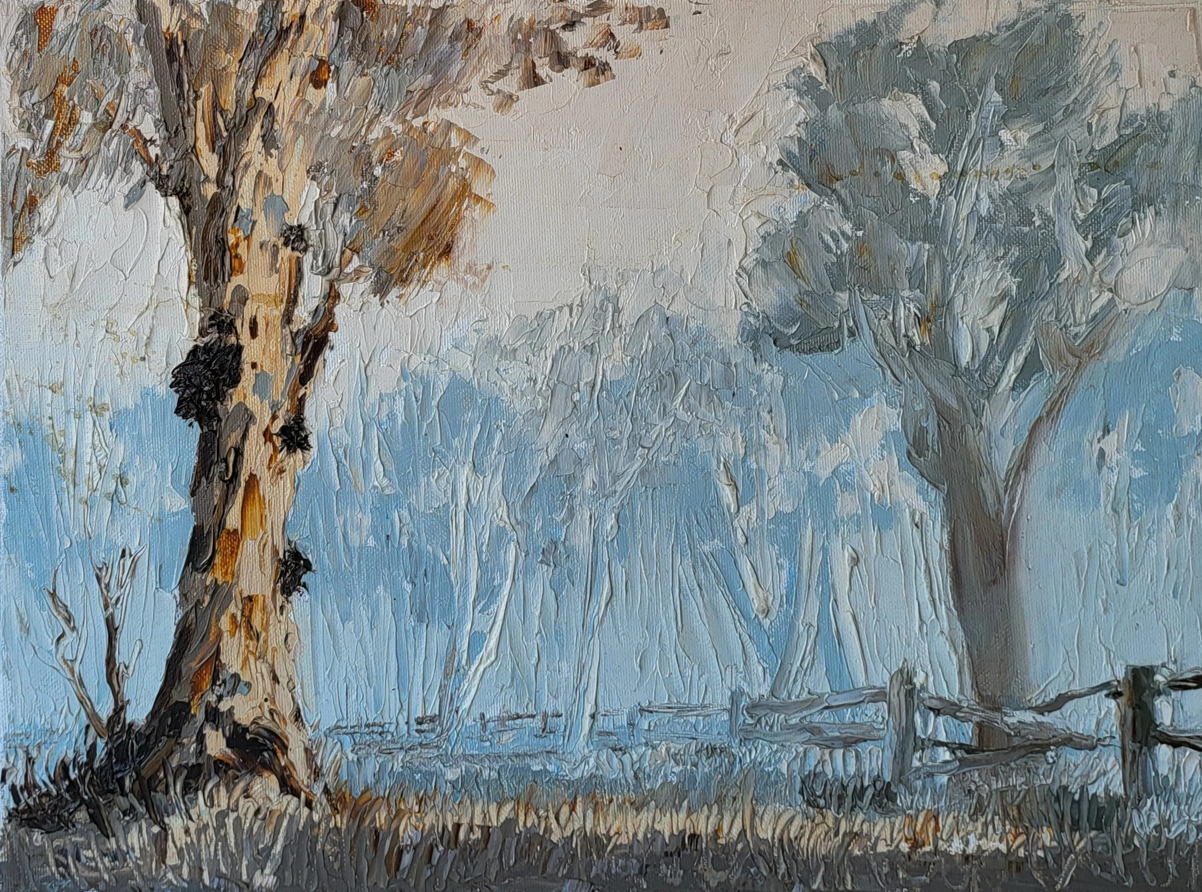 The muted blue-grey palette conveys the cool hush of the forest, while the central tree stands tall in warm tones, a quiet anchor in the scene. A rustic split-rail fence winds through the foreground, grounding the composition in rural Australia.